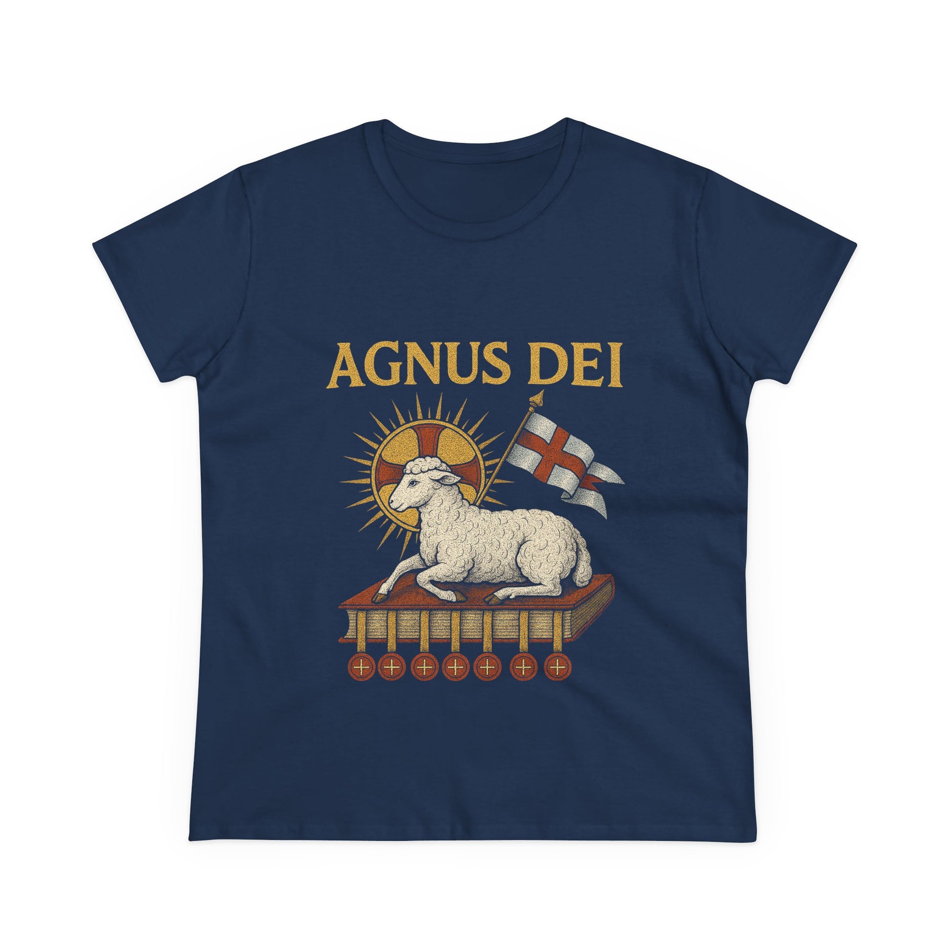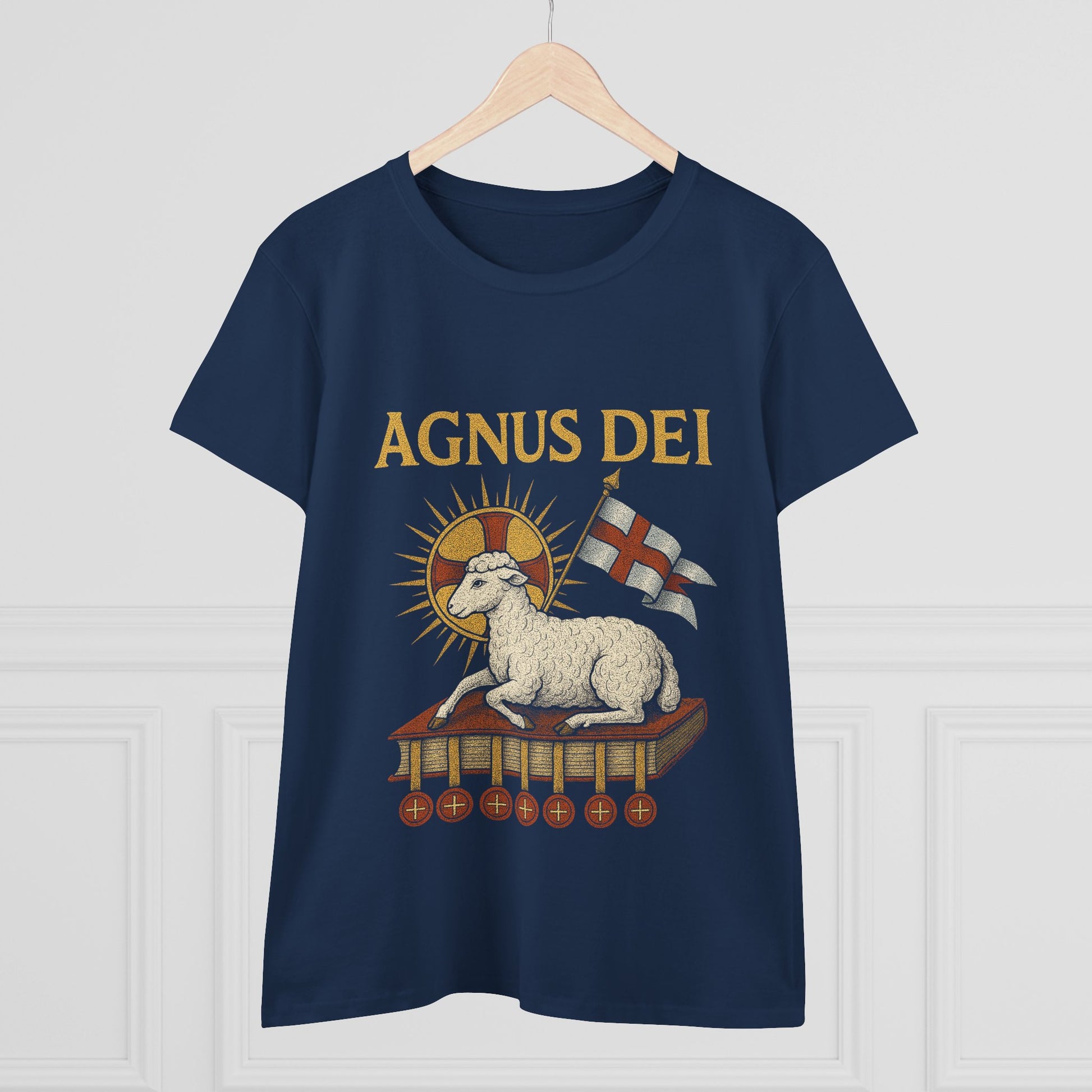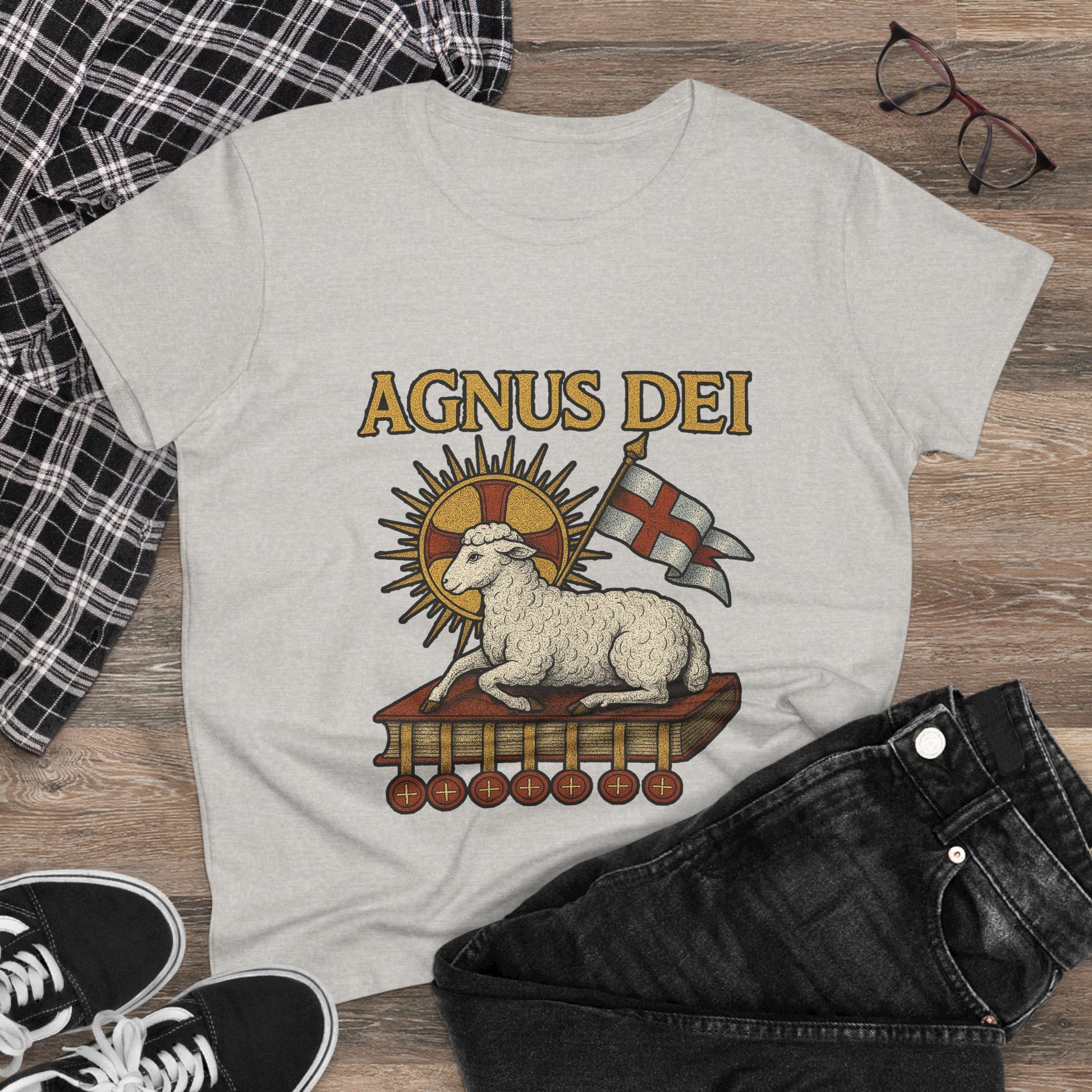 This design depicts the Lamb of God sitting on an apocalyptic book with seven seals. The Lamb has a halo with rays of light and holds a white flag with a red cross of the Risen Christ. The upper inscription - "Agnus Dei" simply means “Lamb of God” in Latin. Stylistically, in creating this female catholic t-shirt print, we were inspired partly by manuscripts, partly by old-school screen print graphics, and partly by missals.