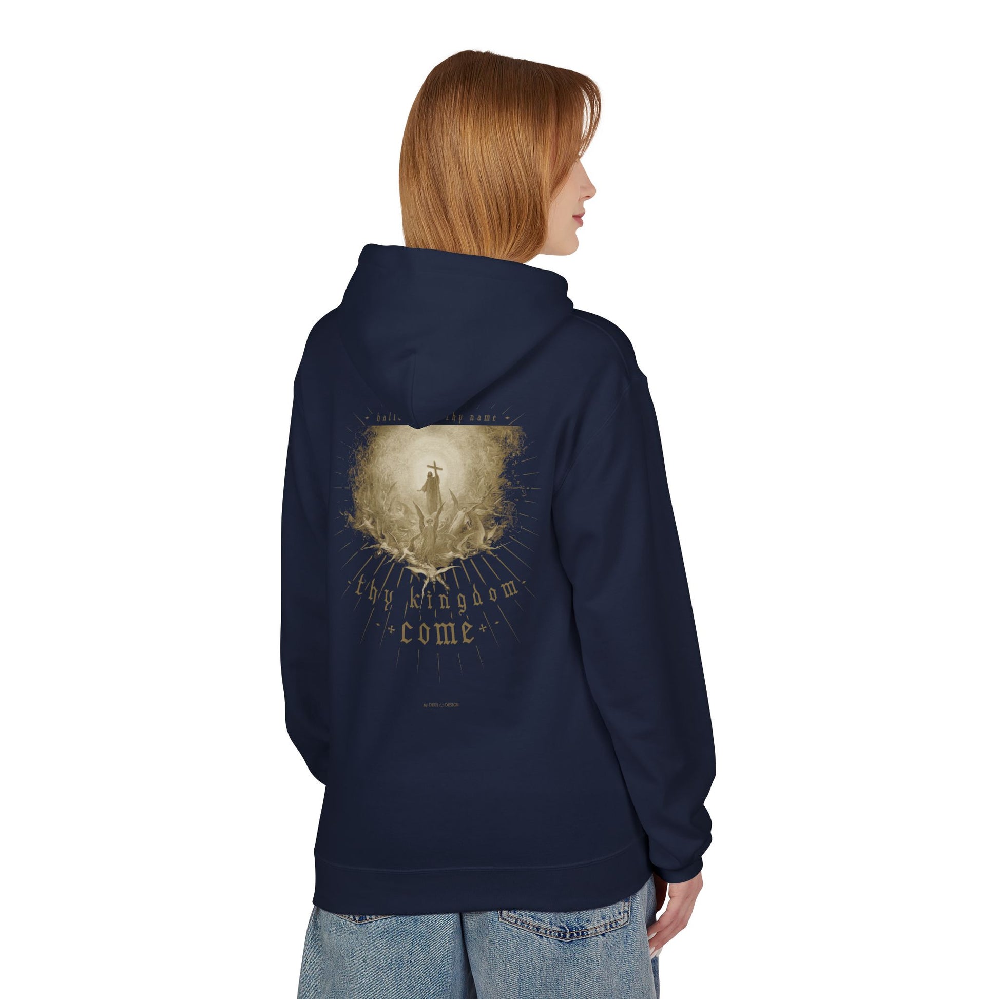 The idea for this project came to me when I was reciting the Lord's Prayer with everyone during Mass. It combines a fragment of this prayer with a complementary image of Christ, coming back to earth surrounded by angels and establishing his kingdom on earth. The perfect Catholic sweatshirt for someone who wants to evangelize and is not ashamed to show their faith. The image is a fragment of a copperplate engraving by Gustave Diore entitled “The Triumph of Christianity over Paganism.” I adapted it, cropped it, altered it, and brightened it up to make it look its best.